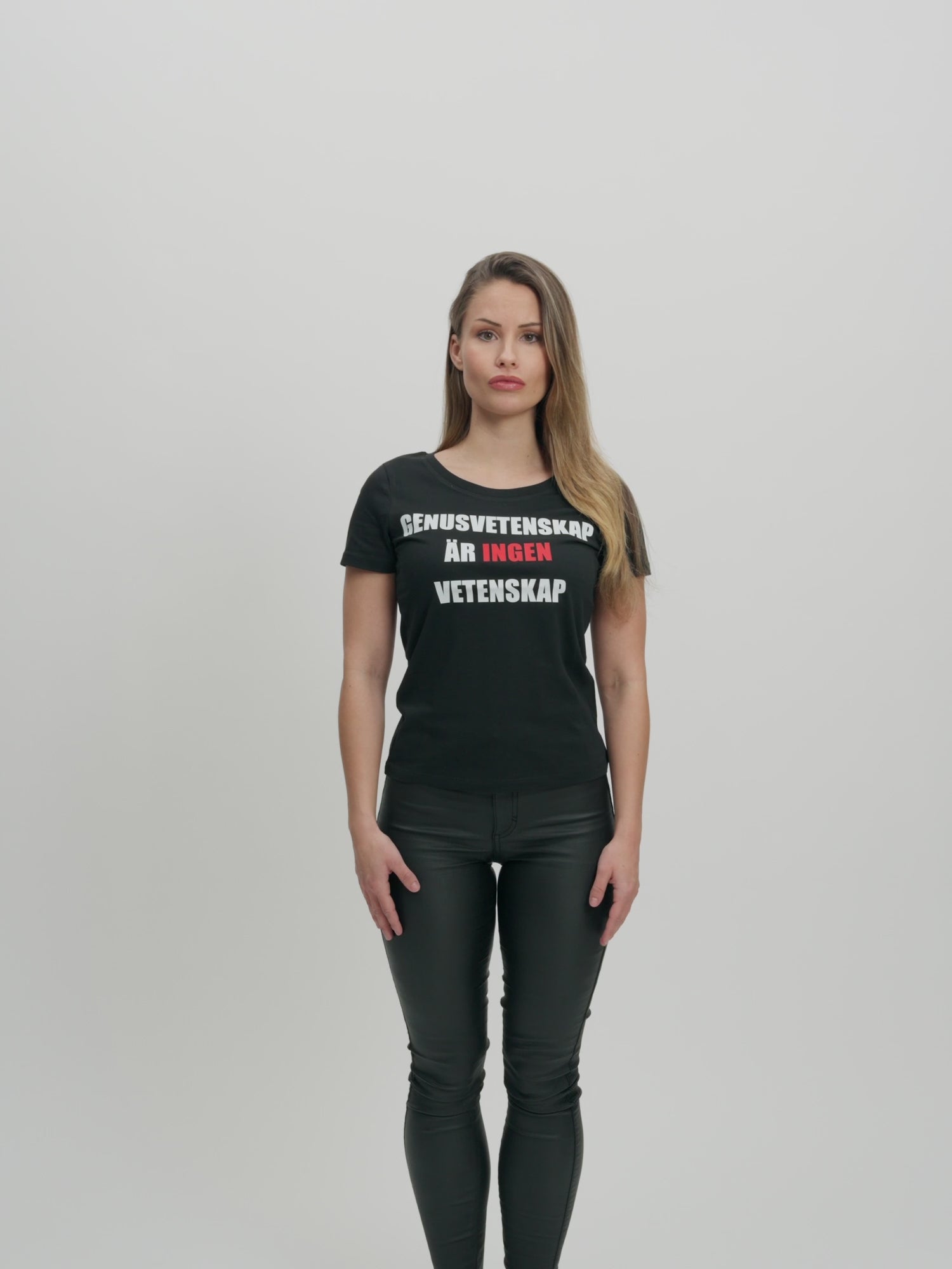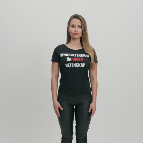 Svart t-shirt med texten “GENUSVETENSKAP ÄR INGEN VETENSKAP”. Mjuk, skön och högkvalitativ 100% bomull. Nu i dammodell!
